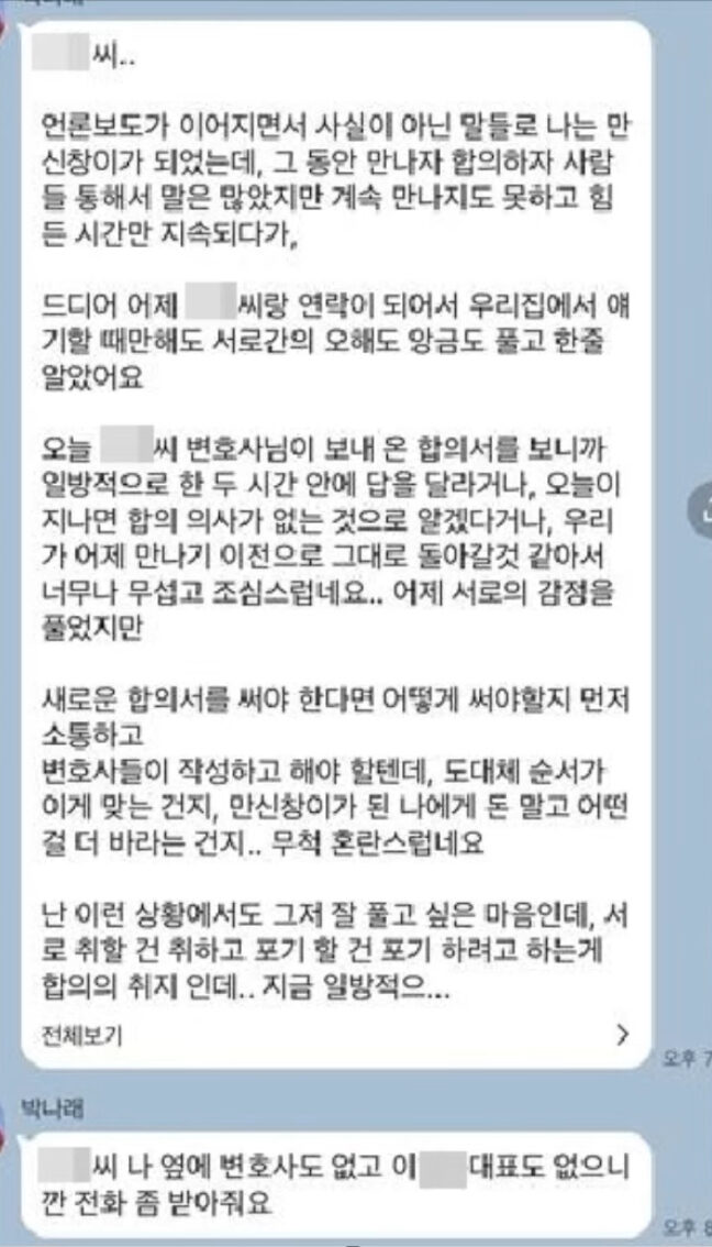 パク・ナレ:おい、[マネージャーの名前]・・・。 報道陣が事実と異なる情報を次々と私に伝えてくるので、結局、私は完全に参ってしまいました。その間、何度も直接会って話をしようと思いましたが、なかなか会うことができず、苦しい時期が長引いていました。そしてようやく昨日、あなたと連絡を取ることができ、私の家で話し合った結果、お互いの誤解が解け、理解し合えたような気がしました。 でも今日、弁護士が送ってきた和解案を見て、1~2時間以内に返事をしないと、今日を過ぎたら和解する意思がないとみなすと要求されて...。このままでは、昨日会う前の状態に戻ってしまうような気がして、正直、本当に怖いし、圧倒されています。昨日、気持ちを共有して、仲直りしたと思っていたのに...。 新たな和解契約書を作成する必要があるのであれば、まず、どのような内容にすべきかを伝え、それから弁護士に作成してもらうべきでは?このやり方が意味があるのかどうかさえ理解できない。すでに悪者のレッテルを貼られている私に、これ以上何を求めているのか......。 それでも、私が望んでいるのは、物事をきちんと解決してほしいということだ。和解の要諦は、守るべきものは守り、手放すべきものは手放すことなのに......今は完全に一方的な感じがする......。 パク・ナレ:[マネージャー名]、今隣に弁護士はいませんし、イさんもいませんので、ちょっと電話に出てください。