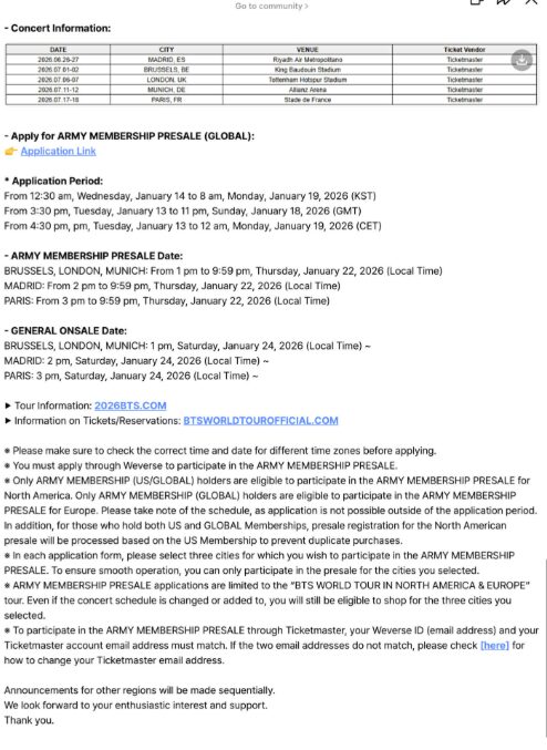 ヨーロッパ公演の場合、販売業者はチケットマスターで、ARMY会員向けか一般販売か、公演ごとに販売時間が異なります。