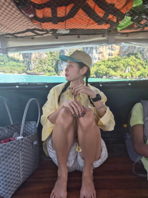 写真の中でソユーは、クラビのビーチとプールを背景にのんびりと休憩を楽しんでいる。